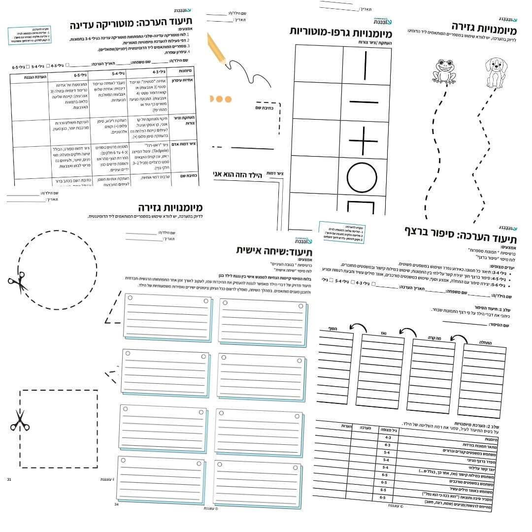 דפי פעילות להערכה ותיעוד בתחום מיומנויות גרפו-מוטוריות,סיפור ברצף ושיחה אישית.