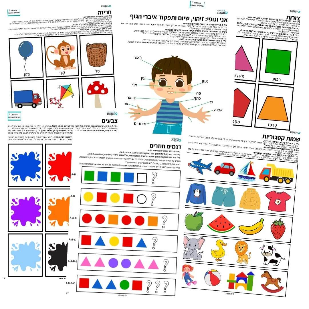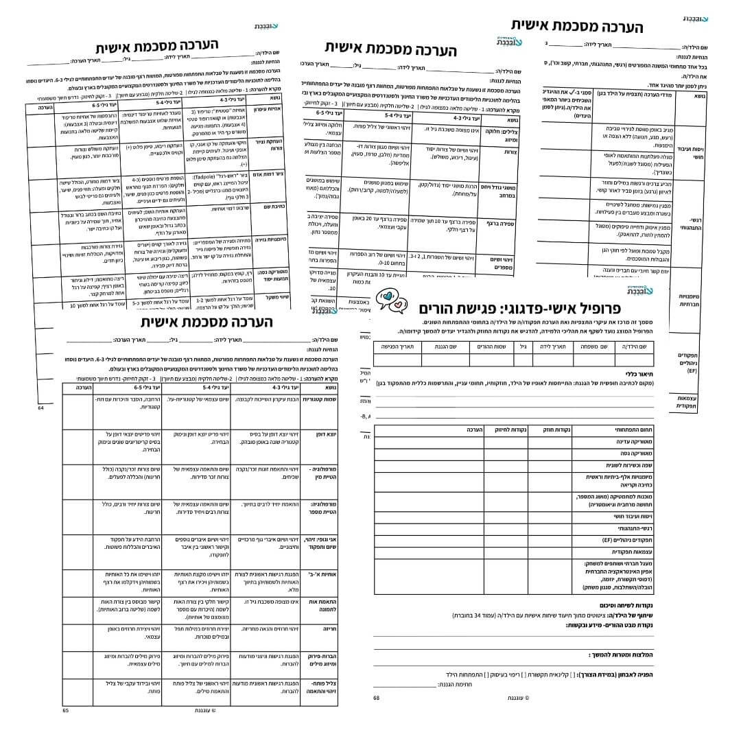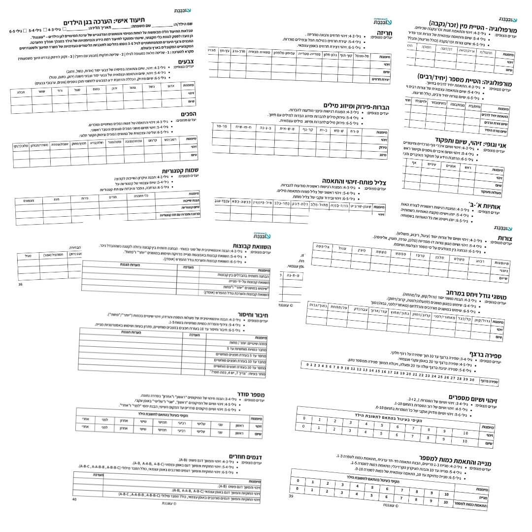 הערכה מתאימה לילדי הגן בגילאי 6-3. היא כוללת פעילויות המתאימות לרמות התפתחות שונות, החל מזיהוי צבעים וצורות ועד לפעילויות מורכבות יותר כמו הבנת מושגים מתמטיים, זיהוי אותיות וסיפור סיפורים ברצף.
